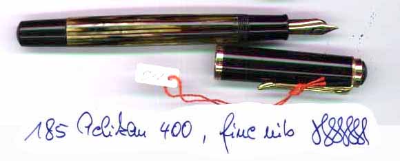 Piston filler, black and green celluloid; cap band engraved "PELIKAN 400", filler knob has a tiny crack which does not affect the function; trim and clip good; pen fills good. |