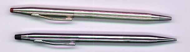surface show signs of use, two small dings in barrel, should be polished up, blue refill included; chrome twist pencil with black end piece, very good surface, no dings, lead and eraser under cap included; both instruments work fine. |