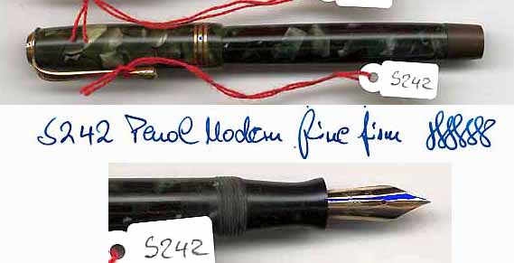 1246 Füller hat neuen Tintensack und ist schreibbereit. Hergestellt von der dänischen Olsen Pen Co., Kopenhagen, die auch Parker und kurze Zeit Esterbrook in Lizenz herstellte. Bekannt wurde die Firma auch durch die in Lizenz hergestellten korallroten Montbalnc der 40er und 50er Jahre. Ab ca. 1942 ergänzte Penol den Aufdruck auf ihren Ambassador-Füllern um das Produktionsdatum. "1146" meint also hier, dass der Füller im November 1946 hergestellt wurde. |
