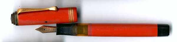 Button filler from the early line with stepped end knob of the Danish Penol Company (see article on Penol in our Bibliotheque from this website). Coral red celluloid, Aero Fill System (started 1937) with ink sack AND ink view window (a Patent was applied for, see engraving) The pen is complete but unrestored, meaning that it needs a new sack and a good polish job. The trim is brassed, the hardrubber parts have a good color. Length closed: 12.5 cm Penol No.7