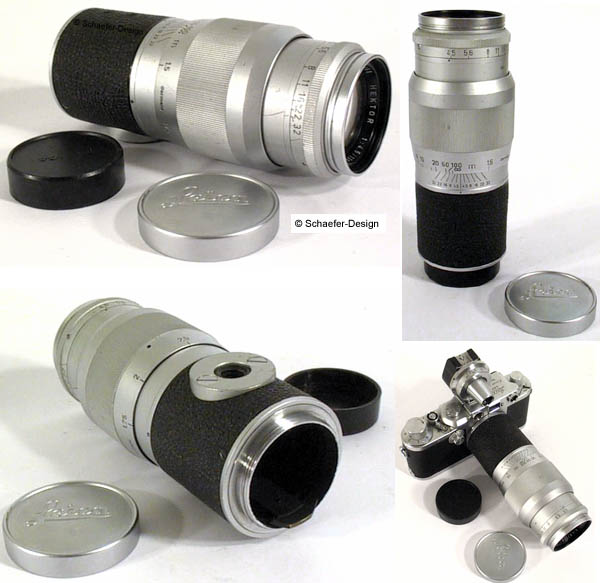 Leica Hektor, 1:4,5 / 135, #1609868 mit Front- und Rück-Kappe / with front and rear cap The lens is in very good condition but there are some signs of use. The leather is in very good condition but a very small part is missing. It is nearly not noticeable. A screw for a tripod is there. Aperture and distance settings works smoothly. The glasses are clear but there are two small marks between the glasses. It looks like dust not like cratches. The lens has a M 39 srew mount for older Leica´s like IIIc / IIIg. Shown with a Leica IIIc on the photo on top. The lens comes with front and rear cap, the rear cap is not Leica. The lens is a nice find for the user and the collector, too. |