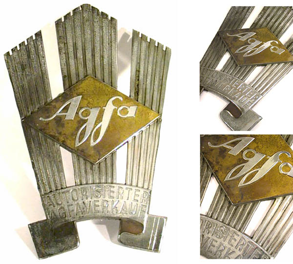 was made of chroma. The AGFA-rhomb was brass. The text in the lover part is: AUTHORIZED AGFASELLER. There are many