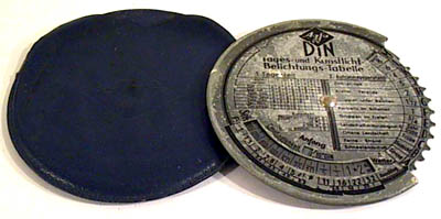 Drehbare Belichtungstabelle für Tages- und Kunstlicht. Anhand von Tageszeit, Aufnahmegegenstand und Wetter