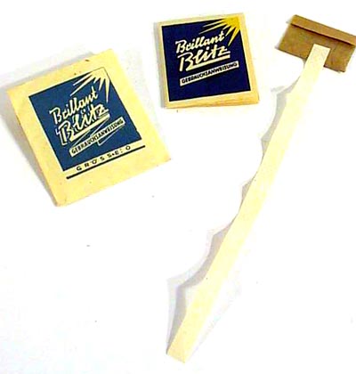 Auszüge aus der Gebrauchsanweisung: .....Blitzbeutel mittels Reißzwecke oder dgl. so an einem Besenstiel befestigen, daß Zündstreifen glatt nach unten hängt. Blitzpulver im unteren Teil des Beutels zusammenschütten und eine obere Ecke des Beutels abreißen, damit ein knallen vermieden wird. ....ZUR BEACHTUNG! Blitzlicht ist kein Kinderspielzeug!" Das zweite Bild oben stammt aus einem Katalog von ~1925 und zeigt den Gebrauch von ähnlichen Blitzlicht-Beuteln. Ein sehr interessantes und seltenes Stück für jeden Sammler.