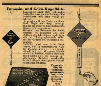 | Parts of the instruction: "Nothing is easier, than making photos with the BRILLANT BLITZLICHT! When a photo becomes bad, you made a mistake! ....Fix the flash-powder bag with a thumbtack on a broomstick. The fuse must hang down. Shake the powder in the low part of the bag and pull back one top edge of the bag, to avoid a bang. ....Note! This flash-powder bag is not a toy!" The second picture on top is from a photo katalog from aboput 1925 and shows how to use flash-powder bags like this. A very interested and rare item for any collector. Any questions? Auction@enter-net.de |