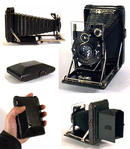 Die Kamera ist optisch und technisch in sehr gutem Zustand! Das Objektiv ist klar und ohne Kratzer, die Blende ist in Ordnung. Alle Metall- Chrom- und Lederteile sind in sehr gutem Zustand. Der schwarze Balgen ist in sehr gutem Zustand und lichtdicht. Die äussere Belederung weist normale Gebrauchsspuren auf. Der Trageriemen ist in gutem Zustand. Alles funktioniert hervorragend, nur die längeren Verschlußzeiten 1, 2, 5, und 10 machen leider Probleme, die anderen Zeiten, 25, 50, 100, 250, Z und D funktionieren aber sehr gut, die Genauigkeit konnte nicht getestet werden. Das Objektiv ist vertikal verstellbar. Die Kamera besitzt einen doppelten Auszug, einen schwenkbaren Brilliant-Sucher mit Wasserwaage (Wasser ist vorhanden) und zusätzlich einen Rahmensucher, mit Klappsucher. Die Scharfeinstellung funktioniert mittels Mattscheibe und einer Rändelschraube, mit der die Länge des Auszugs eingestellt wird. Die Mattscheibe in der Rückwand ist in hervorragendem Zustand, ebenfalls die Klappe. Ich bin aber nicht sicher, ob die Rückwand original ist, das Leder sieht etwas anders aus. Das innere der Kamera ist ebenfalls in sehr gutem Zustand. Die KW-Patentetui der Firma Kamera-Werkstätten Guthe & Thorsch aus Dresden, besticht durch ihr interessantes Design. Zusammengefaltet ist diese Kamera extrem kompakt. Man vermutet nicht, daß sich hier eine Kamera mit doppeltem Auszug verbirgt. Noch Fragen? Auktion@enter-net.de.