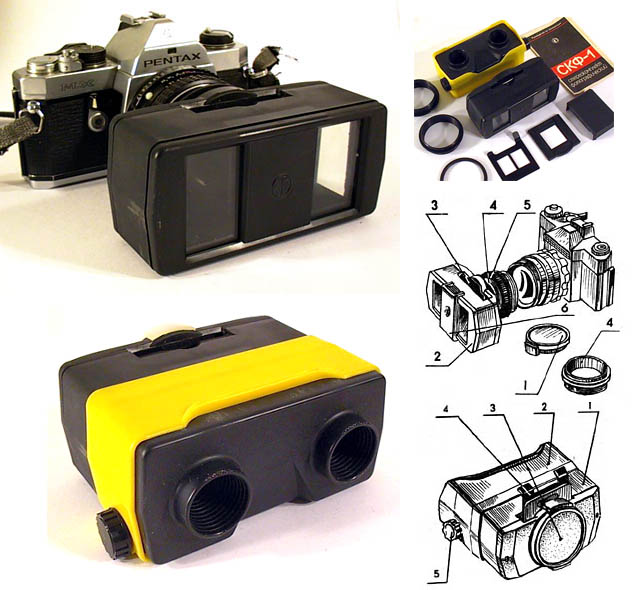 together and there is the viewer. This is not a high-end product but allows an interesting start in Stereo-photography. All parts are in good conditio but may be the mirrors in the device need adjustment. On one mirror a small corner is broken. The illustration on top on the right side shows very well, how to use the device and the viewer. The stereo-set is a russian product and there are instructions in russian language. The camera on the photo on top belonges not to the stereo-set. Any questions? Auction@enter-net.de |