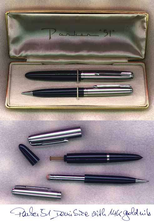 Pen & Pencil Set Demi size in original gift box; Vacumatic filled pen and repel/expel pencil in full working order; dove blue barrels (sorry, not reproducable in scan) and Lustraloy caps (matte stainless steel); both barrels engraved "Rachel Spangler" (could be polished out, not very deep); the pen is great for Parker Penman lovers, I had it filled with this ink for two years now, used it seldomly and it never dried out or skipped, always wrote from the first stroke; length of pon closed 4 13/16 inches. If you want to bring your strange hobby a bit closer to
