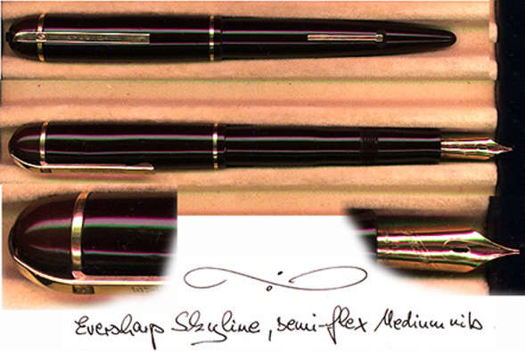 Hebelfüller, Tintenleitsystem mit Saugrohr im Tintensack, sodass der Sack durch mehrmaliges Betätigen des Hebels vollständig gefüllt werden kann, ausserdem soll das System für Druckaus- gleich in Flugzeugen wirken, wunderschönes rötlich schimmerndes schokoladenbraunes Permanite, Wahls Name für Zelluloid (mit Scanner kaum zu reproduzieren...), Standard-Grösse geschlossen 13.2 cm, Gummisack erneuert, getestet und einge- schrieben. Fordert geradezu heraus, mit brauner Tinte geladen zu werden (Waterman Havana, Parker Mocha, etc.) Der Skyline war der Höhepunkt der Streamline-Epoche in den Dreissigern und Vierzigern, er wurde als Nonplusultra an Schönheit und Ausgewogenheit gepriesen. |