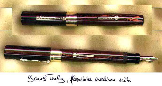 Large fountain pen, made of red and black hard rubber. The wooden marbling of this pen is much nicer in real than the scan can show. A very representative pen ! One broad cap band with engraving "14 Kt. Gold Filled", Large clip and lever engraved "Yours Truly", round lever endpiece enfgraved "MR&S", maybe the company which made this pen and sold it under the private label "Yours Truly". Restored with new rubber sac. All in all this pen is in nearly perfect shape. Oversize length closed 5 3/8 inches, open a whooping 6 5(8 inches ! Ø at cap band 5/8 inches. |