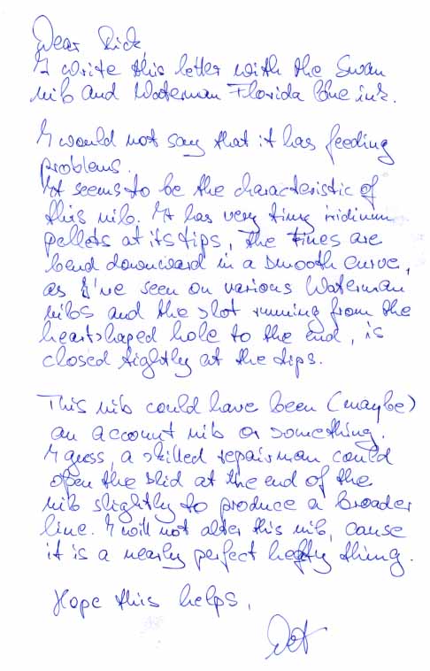 time. This pen is in beautiful condition. The barrel is engraved "SWAN PEN" and the cap end shows the blind mark of a swan. The pen is made from black celluloid, the section is hard rubber. No cracks or scratches. Gold filled trim. Mabie, Todd & Co. held a special patent for their lever, which has a cramp at its underside to prevent lever action by accident. What makes this pen special is its large No. 6 nib to fit this large, elegant pen. New rubber sack, cleaned and tested. Length closed 5 1/8 inches, open 6 7/8 inches ! |