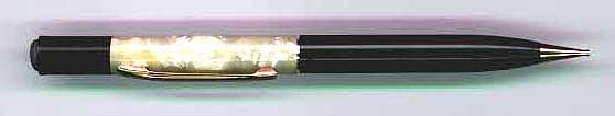 Black pencil with pearlwhite celluloid band. Gold plated trim. Eraser under