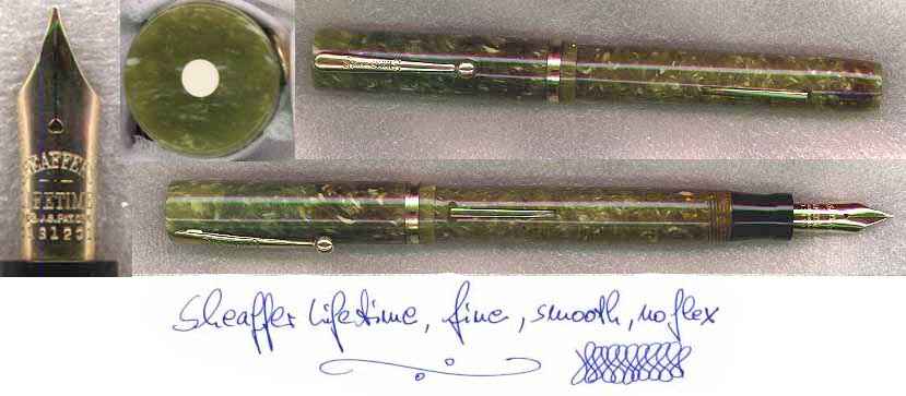 | Besonderheiten - Particularities | AUS MEINER PERSÖNLICHEN SAMMLUNG: Der erste Füller aus Zelluloid überhaupt. Grosser Hebelüller aus jadegrünem Radite, wie Sheaffer das von DuPont erfundene Zelluloid nannte. Dieser Füller war der erste auf dem Markt, der nicht mehr aus Hartgummi hergestellt wurde und damit auch nicht mehr auf die Farben Schwarz oder Rot beschränkt war. Er wurde ein Riesenerfolg, obwohl er zu seiner Zeit über 8 Dollar kostete, damals ein kleines Vermögen. Die Konkurrenz war gezwungen, schnell nachzuziehen, um nicht zuviel Marktanteil zu verlieren. Dieses Modell machte sogar dem beliebten roten Parker Duofold zu schaffen. Wie üblich zeigt auch dieser Füller die typische Materialverfärbung an Halter und Kappe. Dagegen ist leider kein Kraut gewachsen. Den technischen Hintergrund dazu liefere ich gerne auf Anfrage. Restauriert mit neuem Gummisack. Rundum nahezu perfekter Oberfläche. Keine Kratzer oder Risse. Ehite Dot im Kappenkopf. Übergrosse Länge geschlossen 13.4 cm, offen 17 cm ! |