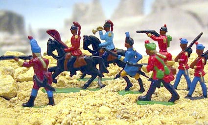 Die Gruppe besteht aus 2 Reitern, und 6 Soldaten mit Gewehren. Zwei Soldaten sind gleich, alle anderen sind unterschiedlich in Uniform und Haltung. Die Fußsoldaten sind ca. 5 cm hoch, die Reiter ca. 6 cm. Die Figuren sind schön handbemalt und in gutem Zustand. Ich kann nicht sagen wie alt die Zinnsoldaten sind. Noch Fragen? Auktion@enter-net.de